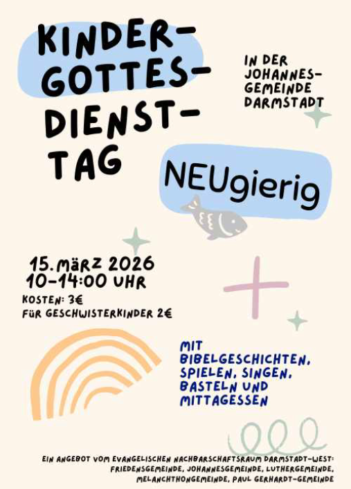 Am 15. März von 10-14 Uhr ist der nächste Kindergottesdiensttag unseres Nachbarschaftsraums für Kinder von 4-12 Jahren. Dieses Mal finder er im Gemeindehaus der Johannesgemeinde, Kahlertstr. 26 statt. Kosten 3 EUR für Geschwsiterkinder 2 EUR. Anmeldung bitte bei der Gemeindediakonin Diese E-Mail-Adresse ist vor Spambots geschützt! Zur Anzeige muss JavaScript eingeschaltet sein.