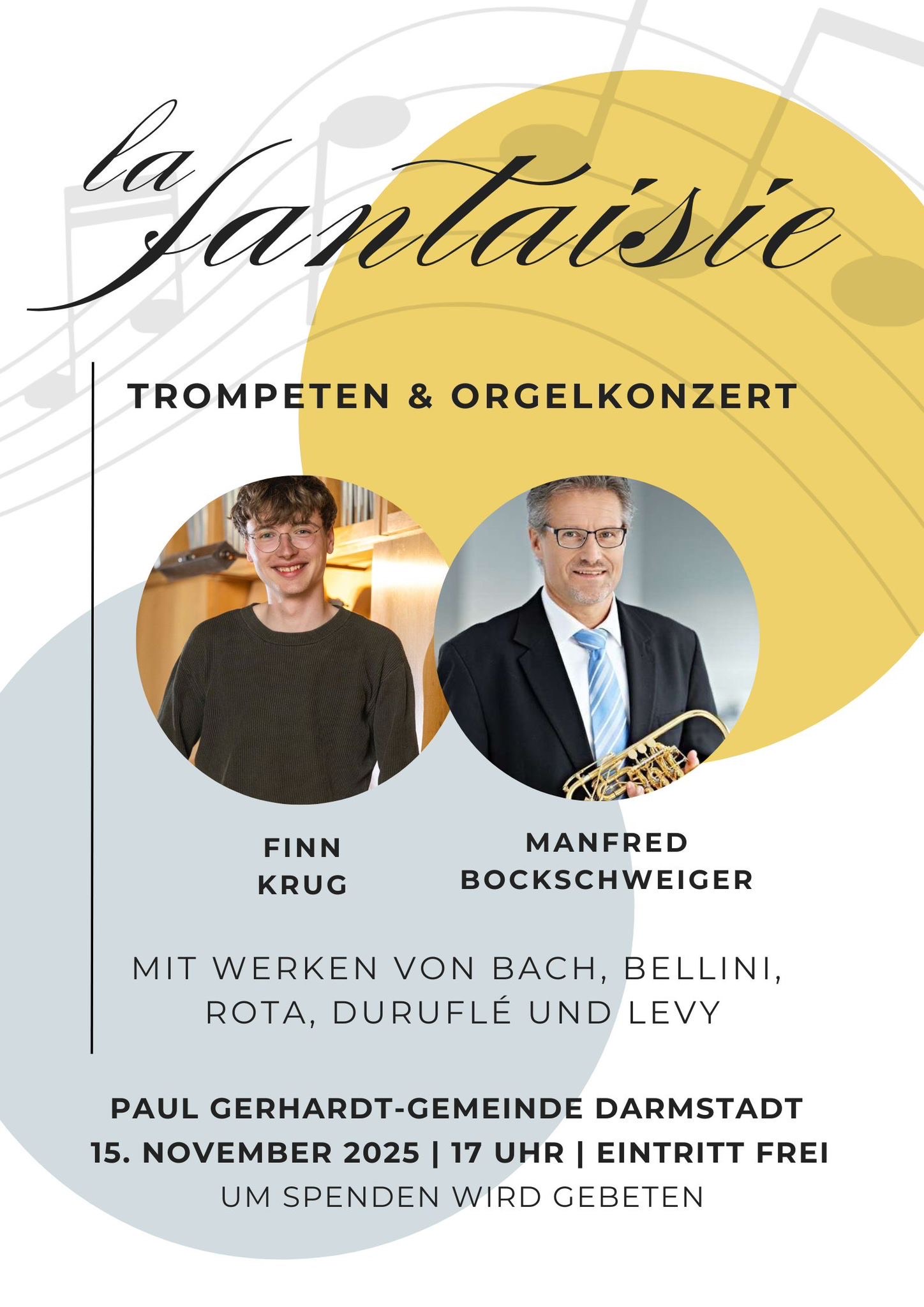 Am 15. November ab 17 Uhr spielen Manfred Bockschweiger (Trompete) und Finn Krug (Orgel) ein Konzert in der Paul-Gerhardt-Kirche. Unter dem Motto “La fantaisie” werden Werke von: Bach, Bellini, Rota, Duruflé und Levy zu hören sein. Der Eintritt ist frei um Spenden wird gebeten.