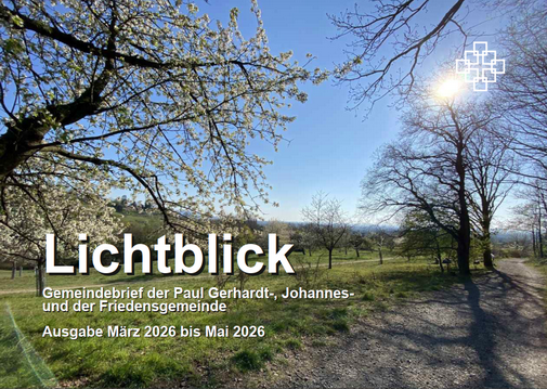 Der Gemeindebrief Lichtblick ist der Nachfolger des beliebten Paul-Gerhardt-Boten. Die Gemeindebriefe der Johannesgemeinde, der Paul-Gerhardt-Bote und der Gemeindebrief der Friedensgemeinde sind nun eins. Drei Redaktionen haben sich zusammengefunden und präsentieren Ihnen nun den „Lichtblick“, der Ihnen viel Erhellendes aus den Nachbargemeinden und dem Nachbarschaftsraum zeigen will und gleichzeitig den Blick auf den lenken will, der das Licht der Welt ist, Jesus Christus.