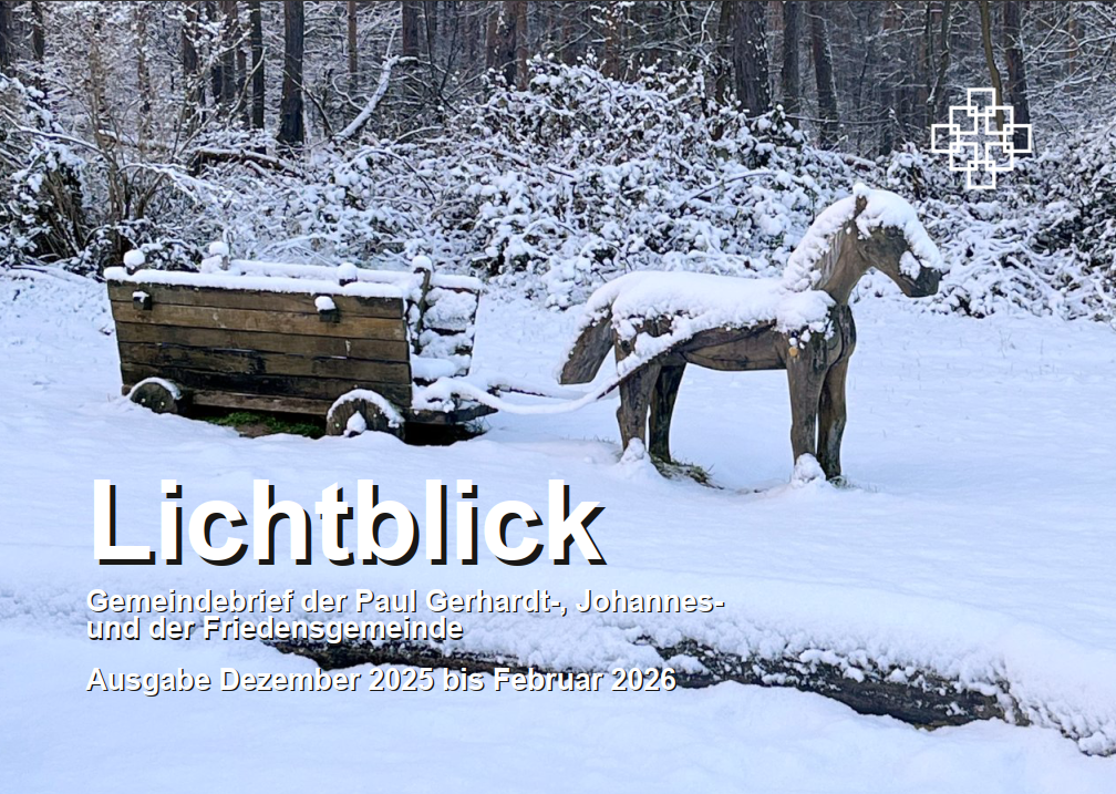 Der Gemeindebrief Lichtblick ist der Nachfolger des beliebten Paul-Gerhardt-Boten. Die Gemeindebriefe der Johannesgemeinde, der Paul-Gerhardt-Bote und der Gemeindebrief der Friedensgemeinde sind nun eins. Drei Redaktionen haben sich zusammengefunden und präsentieren Ihnen nun den „Lichtblick“, der Ihnen viel Erhellendes aus den Nachbargemeinden und dem Nachbarschaftsraum zeigen will und gleichzeitig den Blick auf den lenken will, der das Licht der Welt ist, Jesus Christus.