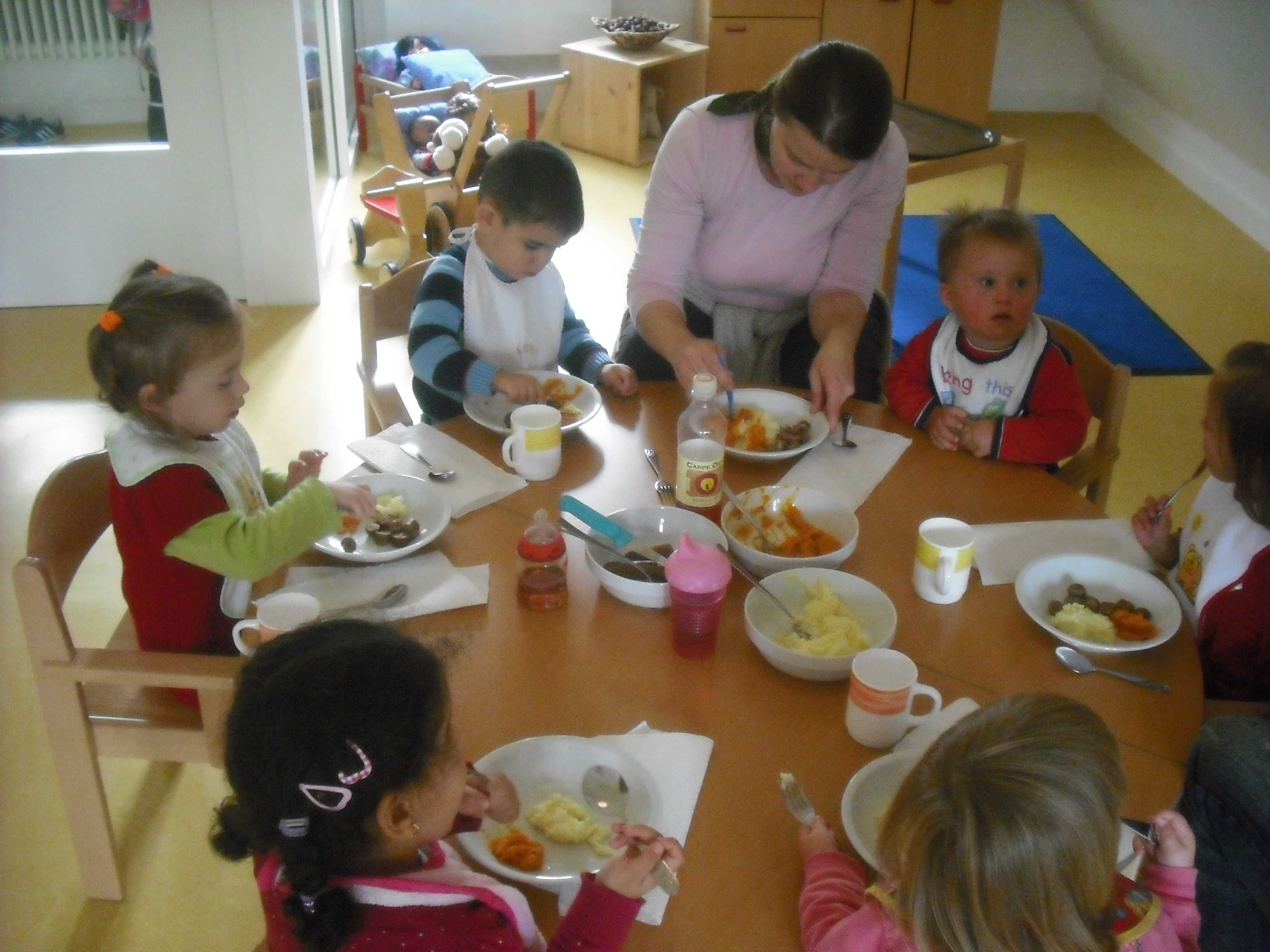 Krippenkinder lernen und erleben mit allen Sinnen. Das Essen und somit jede einzelne Mahlzeit im Tagesablauf ist eine wichtige Zeit in der Ganzheitlich unterschiedlichste Lernprozesse stattfinden. Dabei geht es nicht nur ums Essen, viel wichtiger sind die sozialen Kontakte. Wir essen gemeinsam mit den Kindern am Tisch. Und wir beginnen jede Mahlzeit mit einem Gebet und beenden die Mahlzeiten gemeinsam.